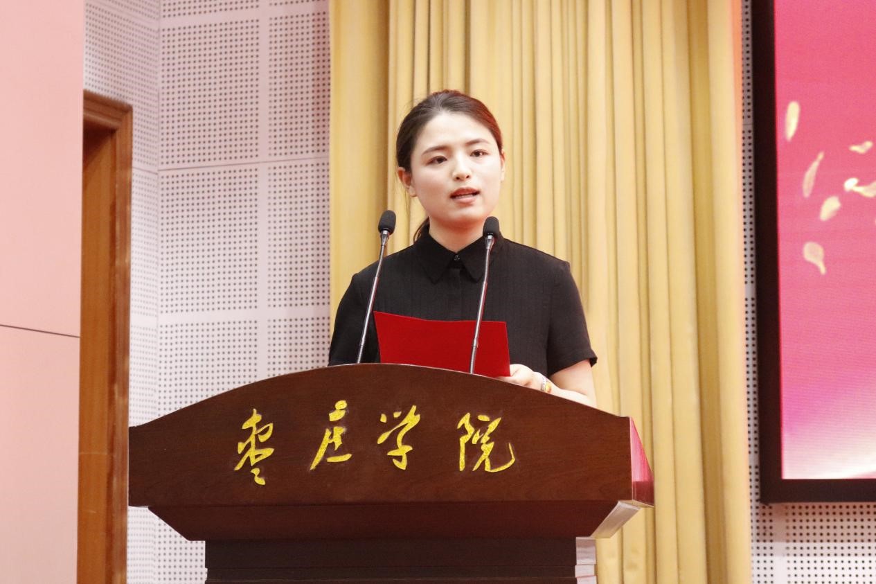 毕业生辅导员张萍萍作为教师代表发言。她代表全院教师向2023届毕业生同学表示衷心的祝贺,祝贺同学们完成学业,迈向新的征程。她表示,完成阶段性学业只是“万里长征走完了第一步,以后的路程更长,工作更伟大,更艰苦”,她希望同学们要摆正自己的位置,始终用平和的心态,以更加扎实的专业能力造福社会;要不忘学习,树立终身学习的理念,在学习中获取前进的力量。