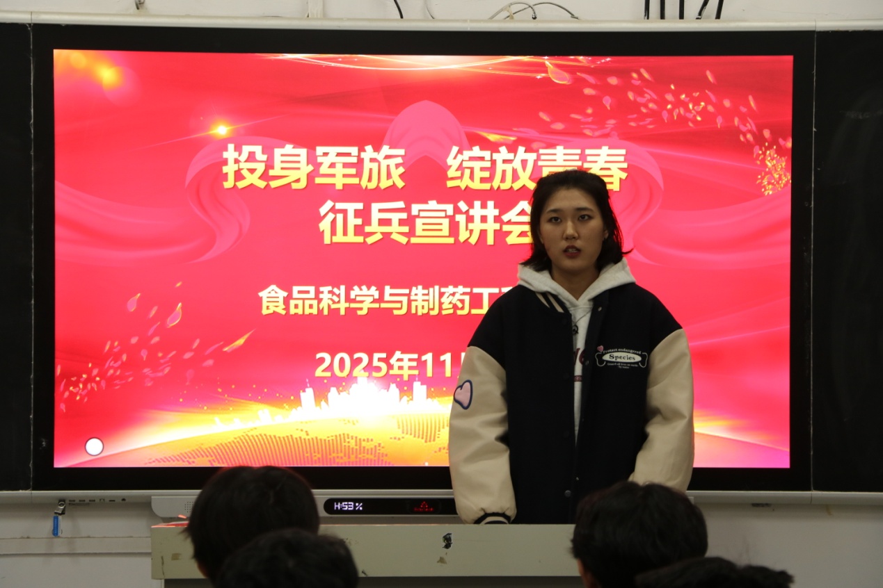 为厚植家国情怀,引导食药学子肩负起新时代强军使命,11月9日,必赢242net官网在文科楼举办征兵政策宣讲会。活动由专职辅导员张猛老师主持,2025级退役大学生士兵丁睿祺同学与怀揣军旅梦的同学们进行面对面交流。