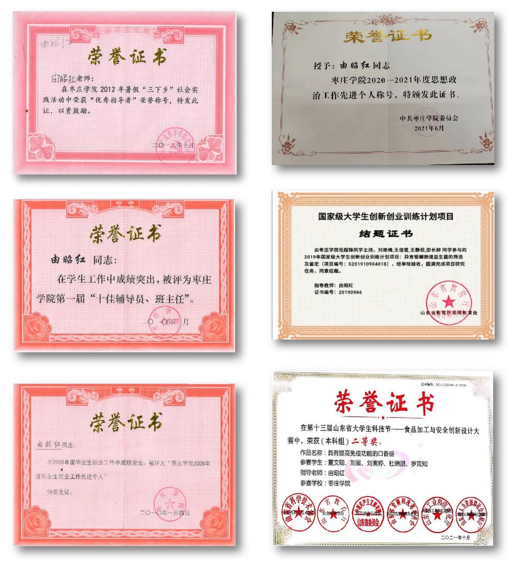 1. 思政方面:荣获“枣庄学院思想政治工作先进个人”2次,获“枣庄学院十佳辅导员班主任”荣誉称号1项。