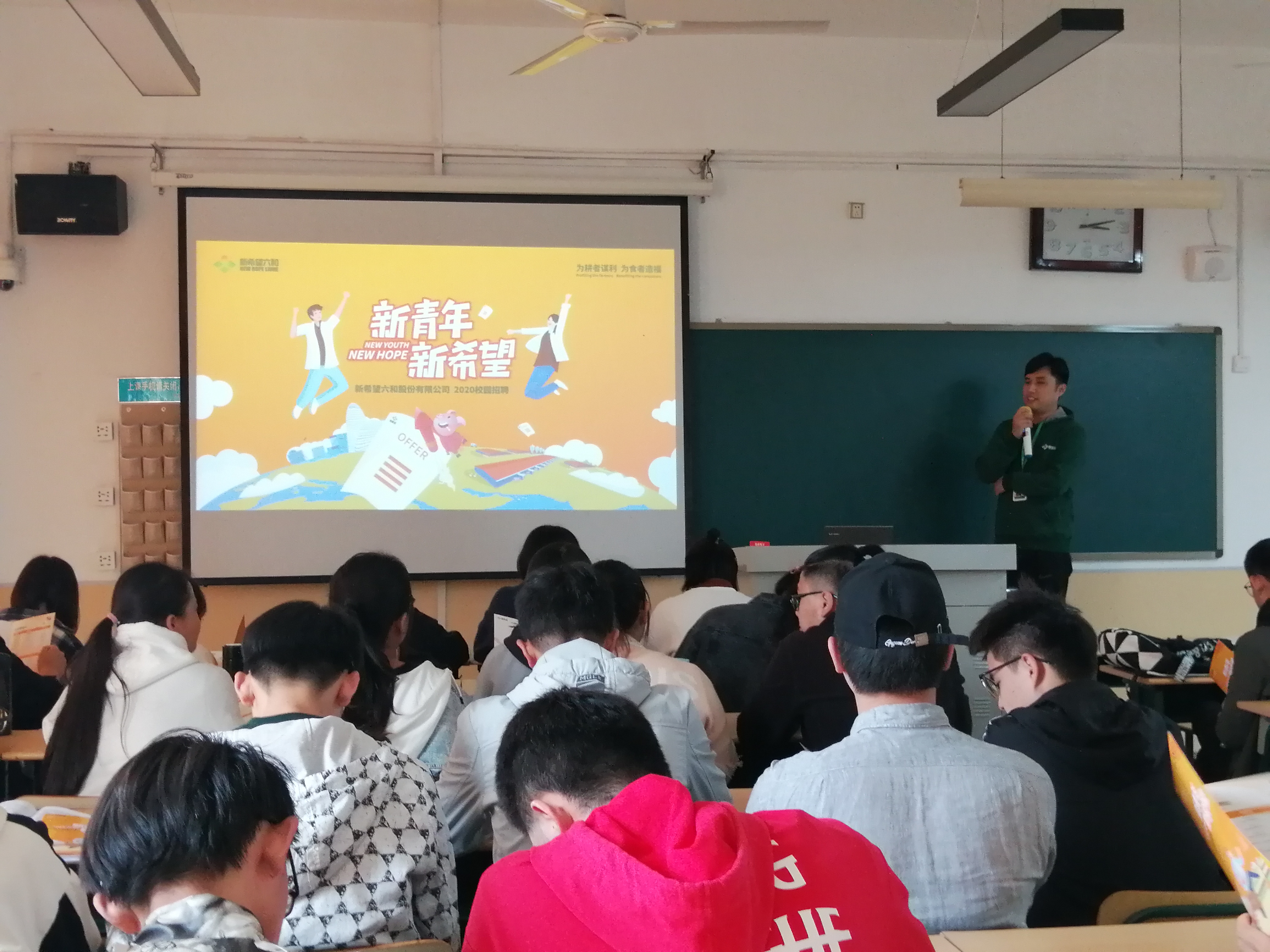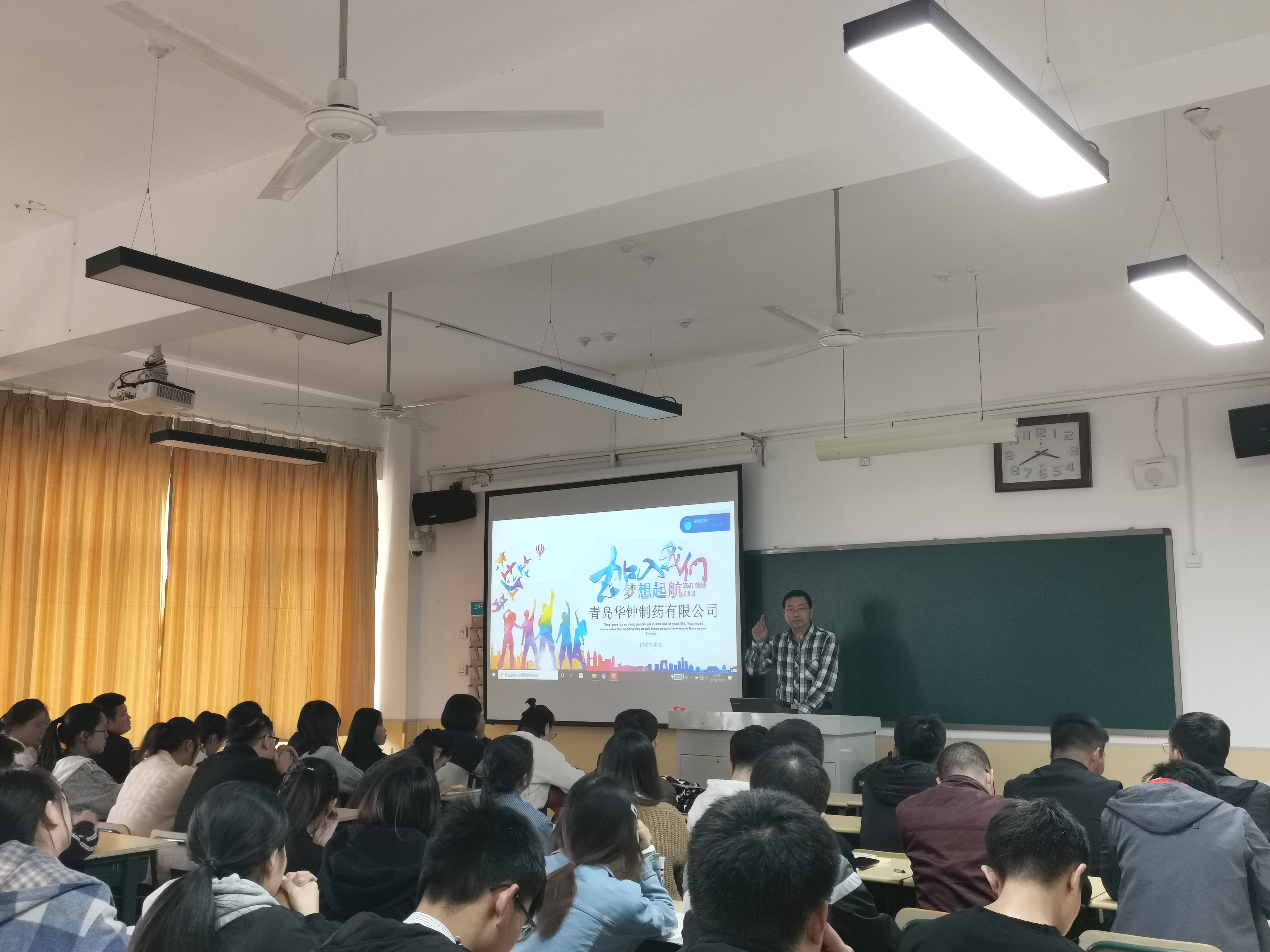 来自两家企业的经理分别从企业概况、企业发展历程、企业员工培养模式、企业发展现况、发展前景和招聘岗位信息等方面进行了介绍。此外,新希望六和股份有限公司的王经理以人力发展与教育为题介绍了企业用来培养人才的两个学院——商学院和产业学院。青岛华钟制药有限公司的负责人介绍了企业的相关部门和企业的福利待遇。