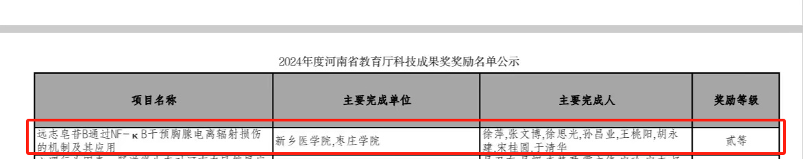 必赢官网必赢242net官网高层次专家人才徐萍教授与新乡医学院联合申报的“远志皂苷B通过 NF-κB干预胸腺电离辐射损伤的机制及其应用项目获二等奖,徐萍为该项目负责人,第一获奖人。