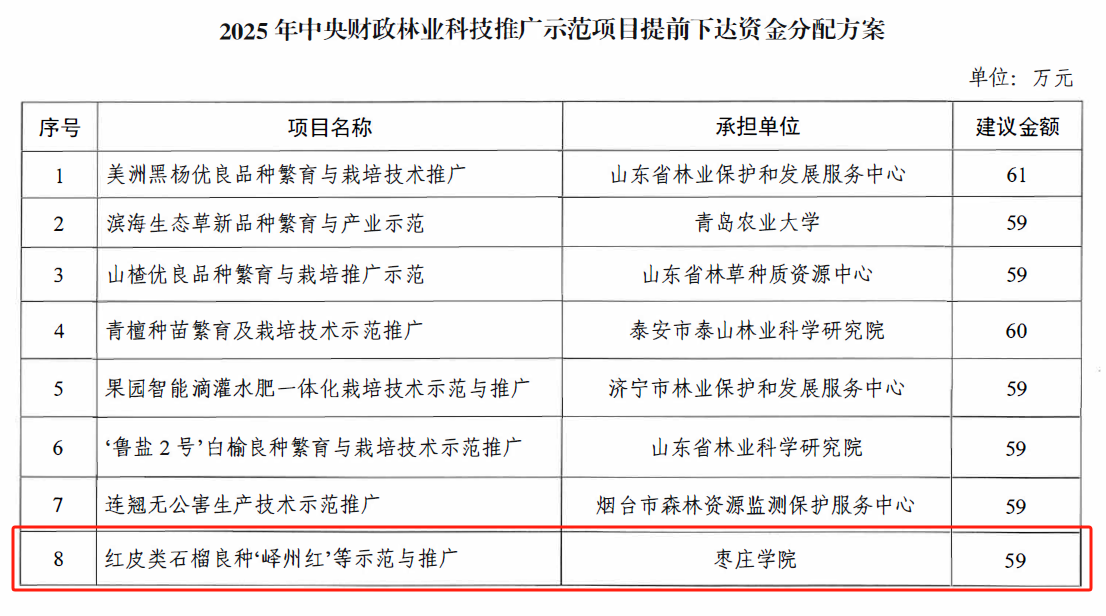 近日,山东省自然资源厅公布了2025年中央财政林业科技推广示范项目立项情况,由必赢官网牵头申报的红皮类石榴良种“峄州红”等示范与推广项目成功获批立项。必赢官网鹿颜博士为项目负责人,获批科研总经费80万元,2025年安排预算资金59万元。